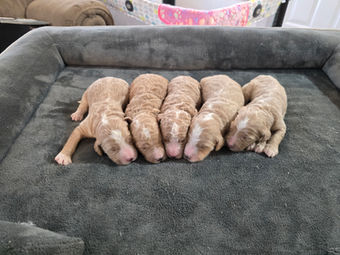 We are thrilled to announce the arrival of our F1B Standard Goldendoodle puppies from Robin and Barkley.